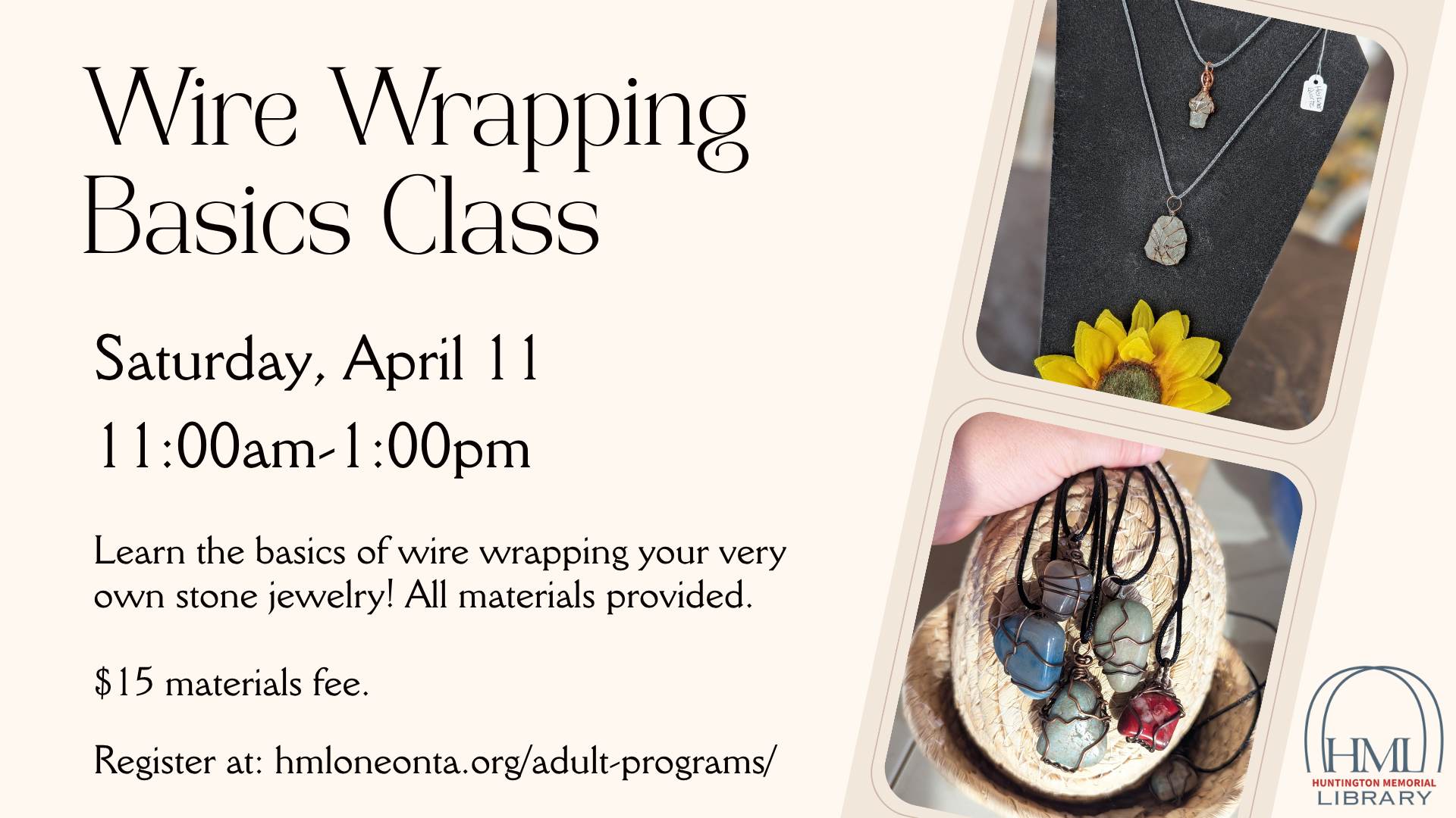 Learn the basics of wire wrapping your very own stone jewelry with Amanda Trumbull of Soul Crystal Creations! Participants will have their choice of a raw tumbled stones or a raw Herkimer quartz to wrap in copper on a black cord necklace.